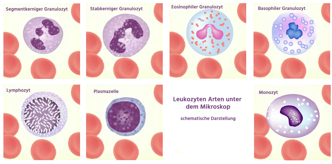 Der häufigste Grund für einen zu hohen Leukozyten Wert (Leukozytose) ist eine reaktive Vermehrung der Granulozyten und ihrer Vorstufen, die bei einer Infektion auftreten kann. Über verschiedene inflammatorische Zytokine werden die Leukozyten in die Blutbahn um verteilt (schnell) und auch vermehrt im Knochenmark gebildet (etwas träger).